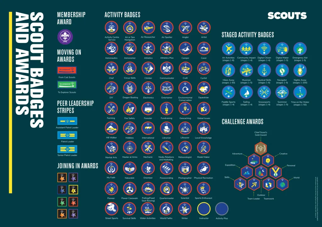 Like within the other sections, Scouts can achieve a large and varied range of challenge & activity badges that cater for every taste, skill and capability. There are also core badges for joining or moving on from the Troop or for time spent in the Scouting movement.